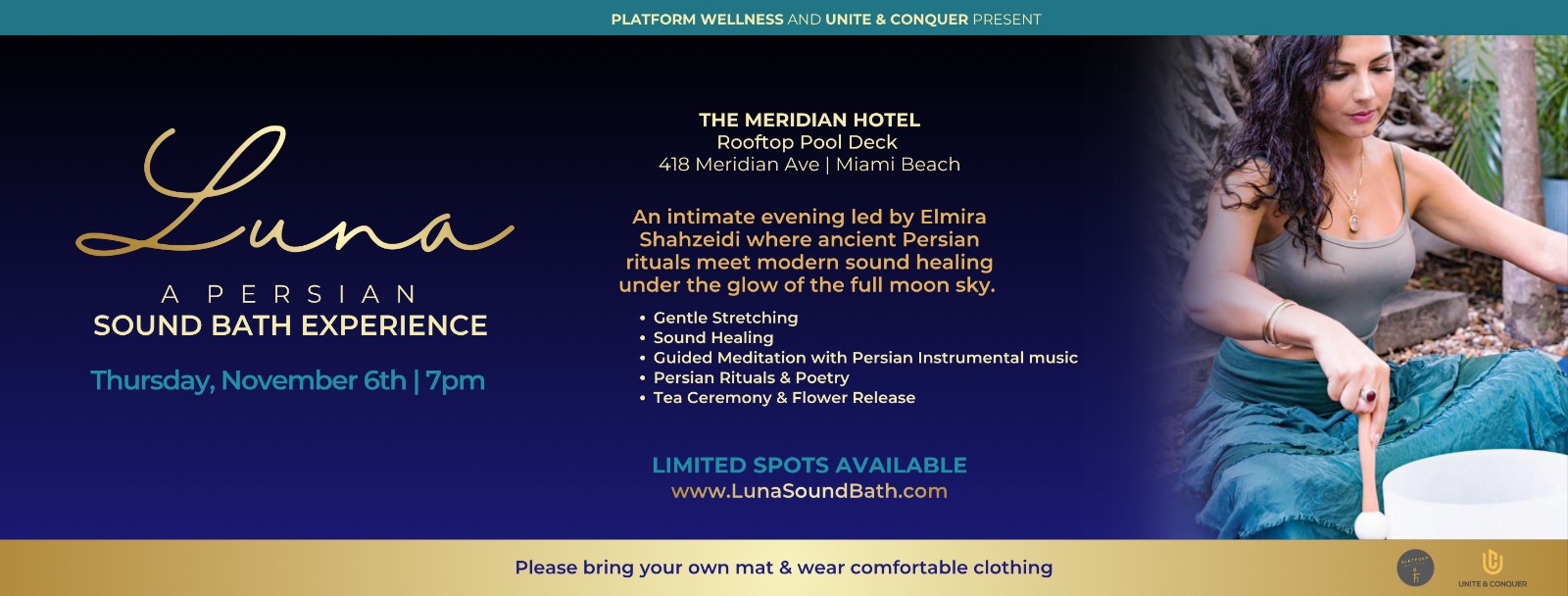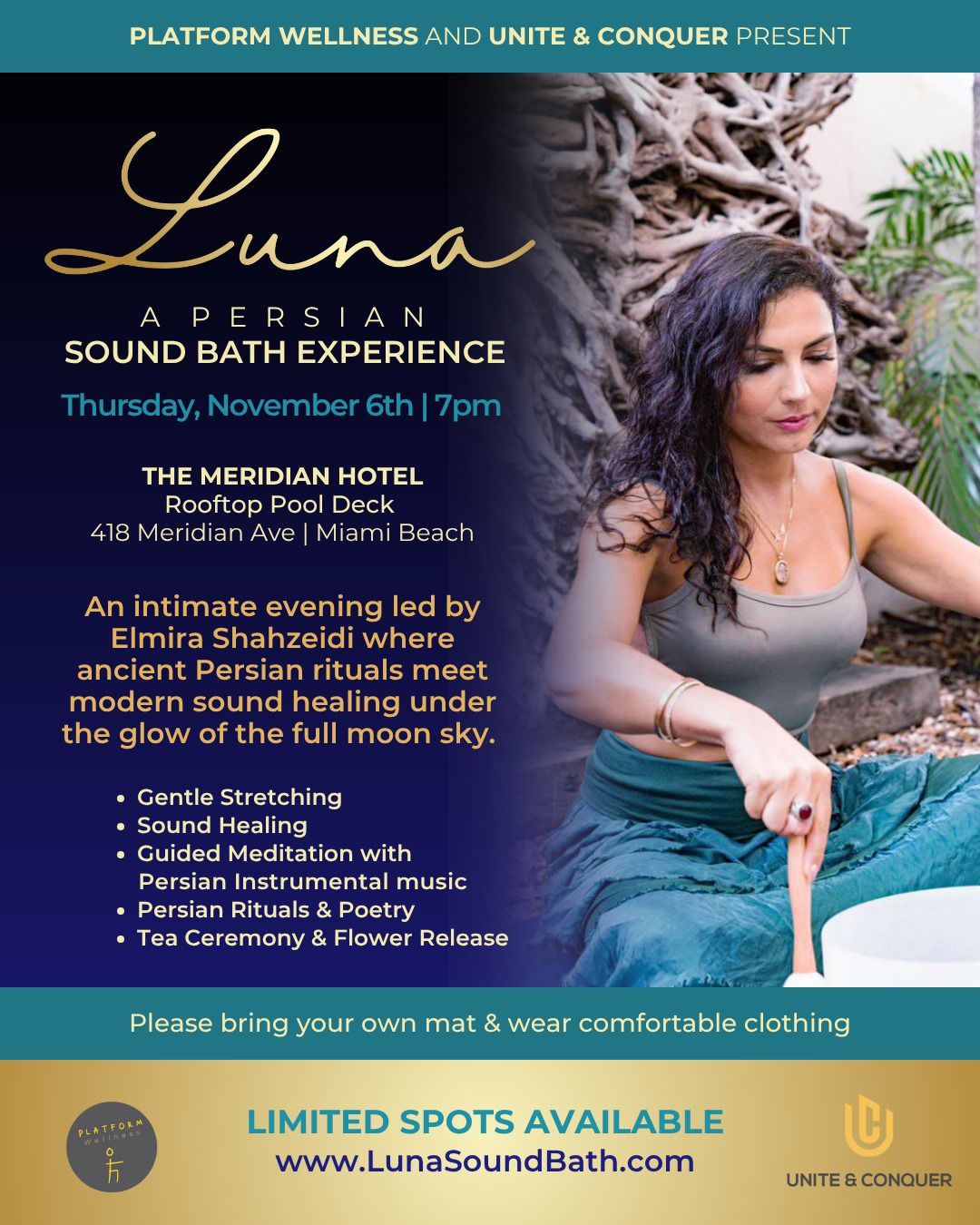 - Space is limited—this is an intimate, one‑of‑a‑kind Persian sound bath experience in South Florida. Reserve your place now.